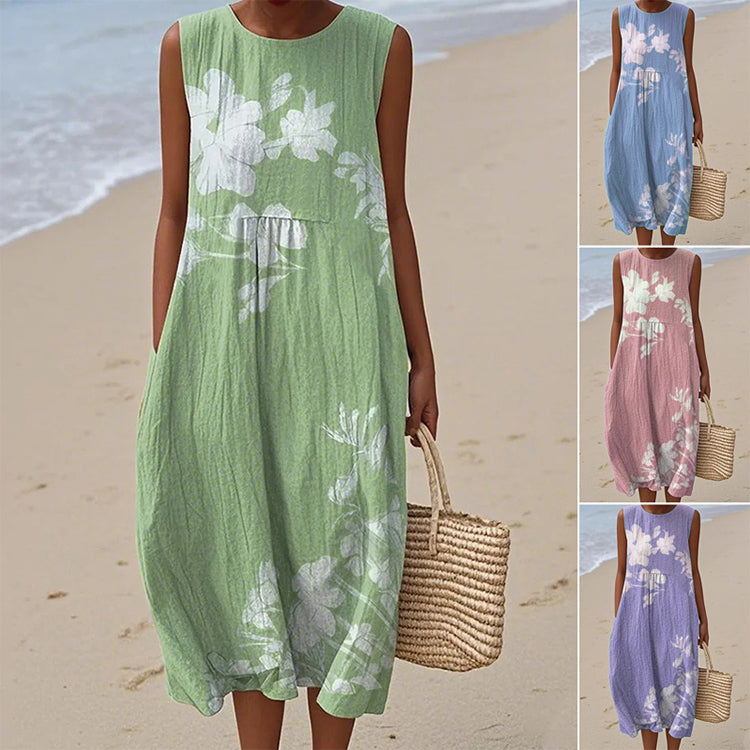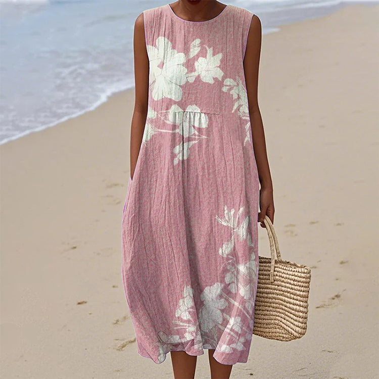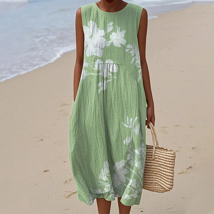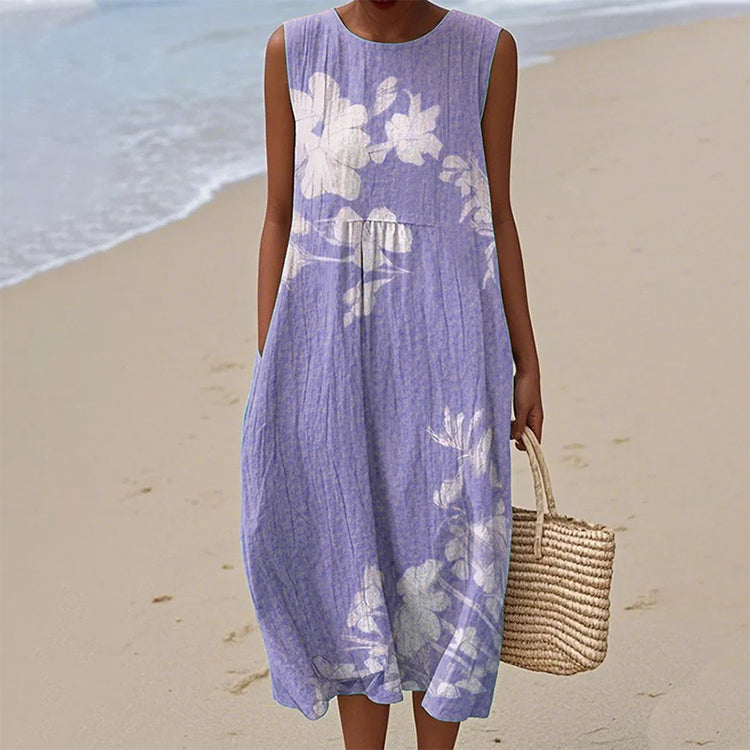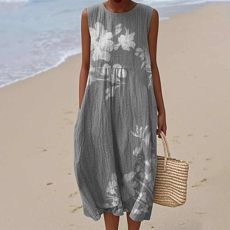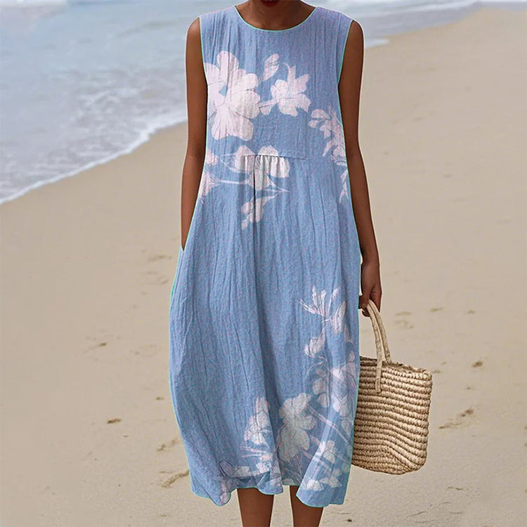 Ελαφριά σαν αεράκι, αβίαστη κίνηση - Αυτή η σιλουέτα που κυλάει σαν καλοκαιρινή αύρα, αγκαλιάζει το σώμα με διακριτική κομψότητα. Το χαλαρό κόψιμο προσφέρει άνεση χωρίς να θυσιάζει το στυλ, ενώ το αμάνικο κόψιμο σας κρατά δροσερή, καθιστώντας το ιδανικό για ζεστές μέρες και δροσερά βράδια.