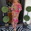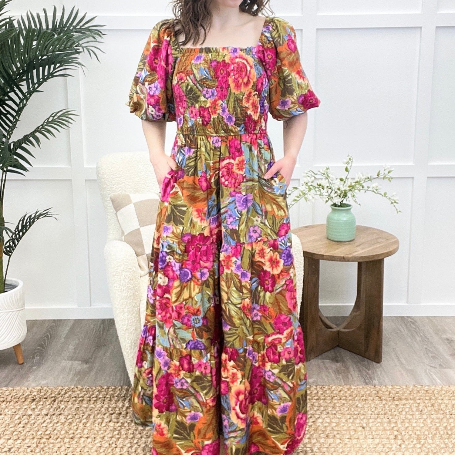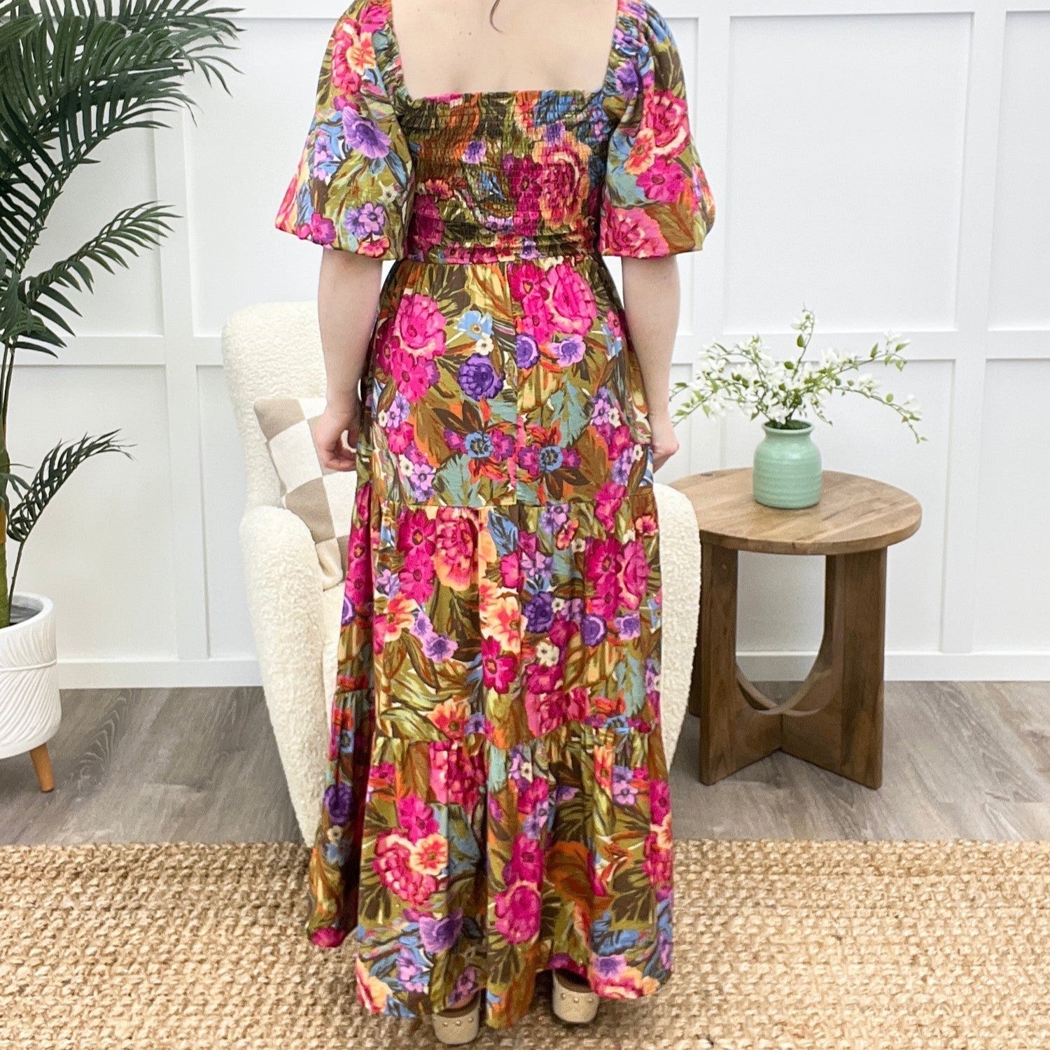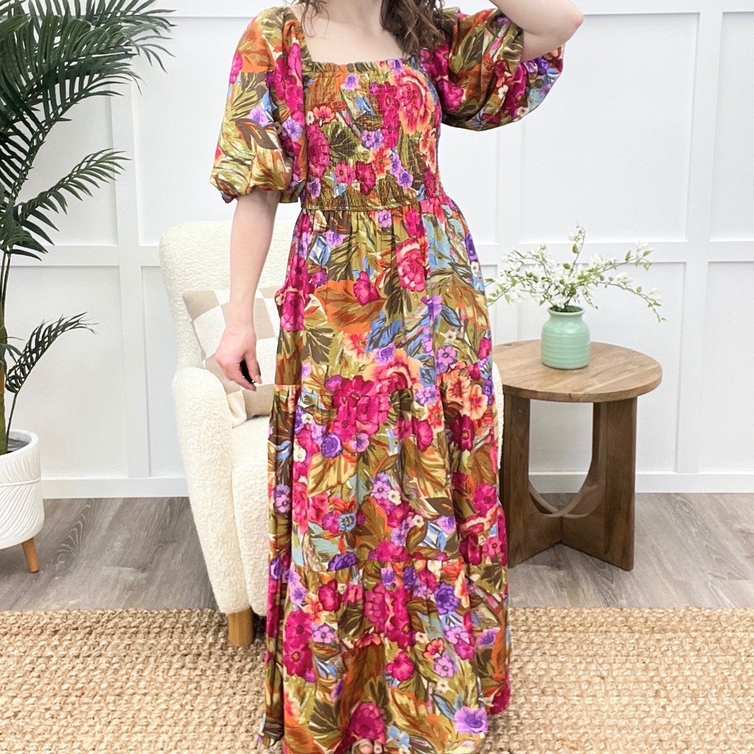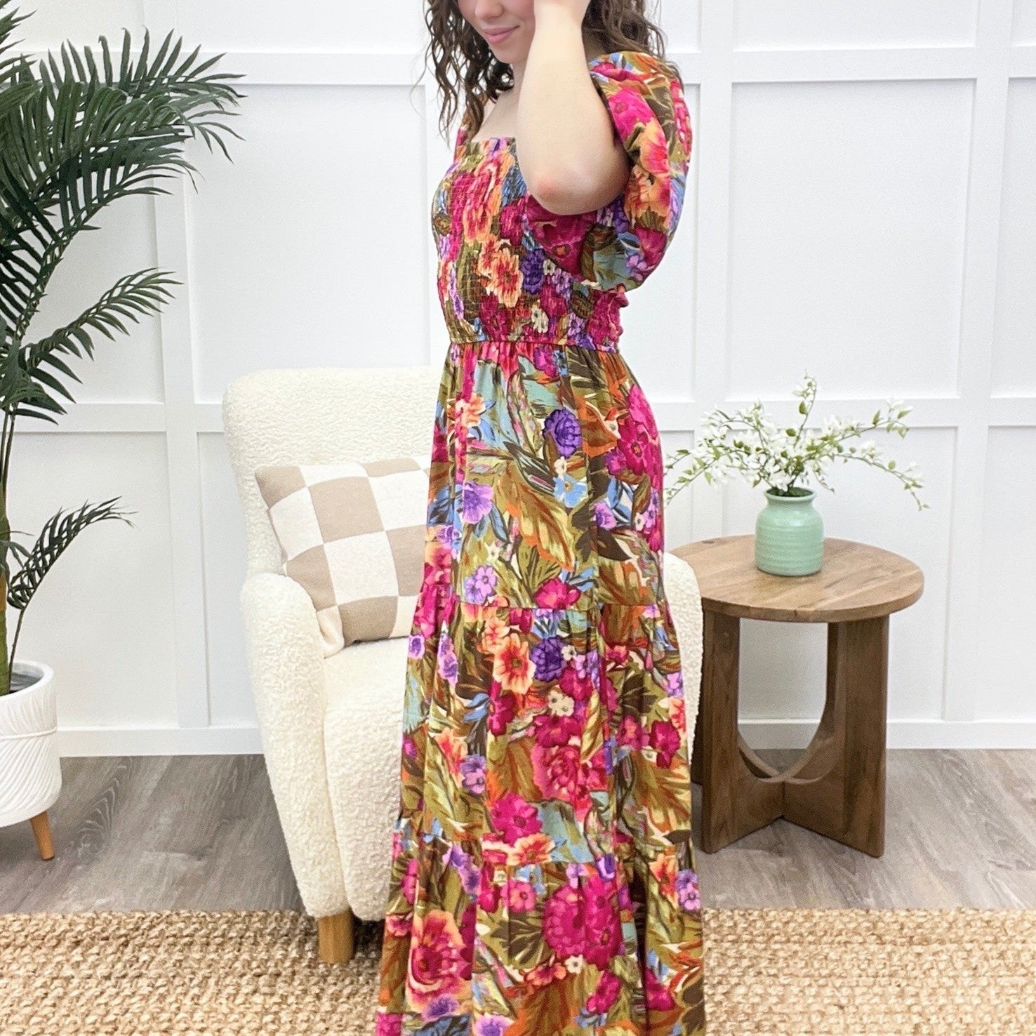 Ζωηρό floral μοτίβο σε χρώματα ελιάς, έντονο ροζ, μοβ, πορτοκαλί και μπλε