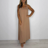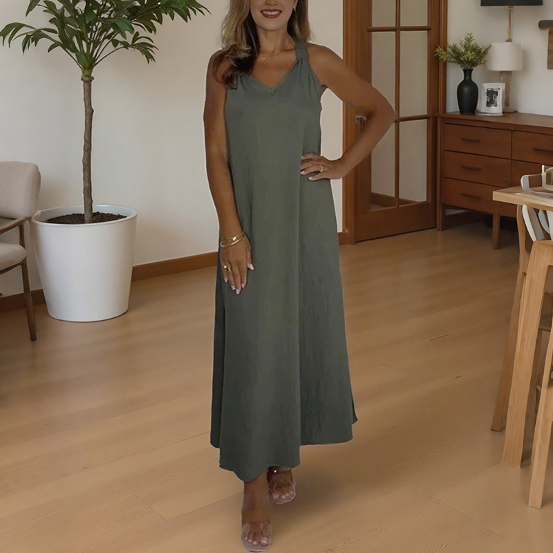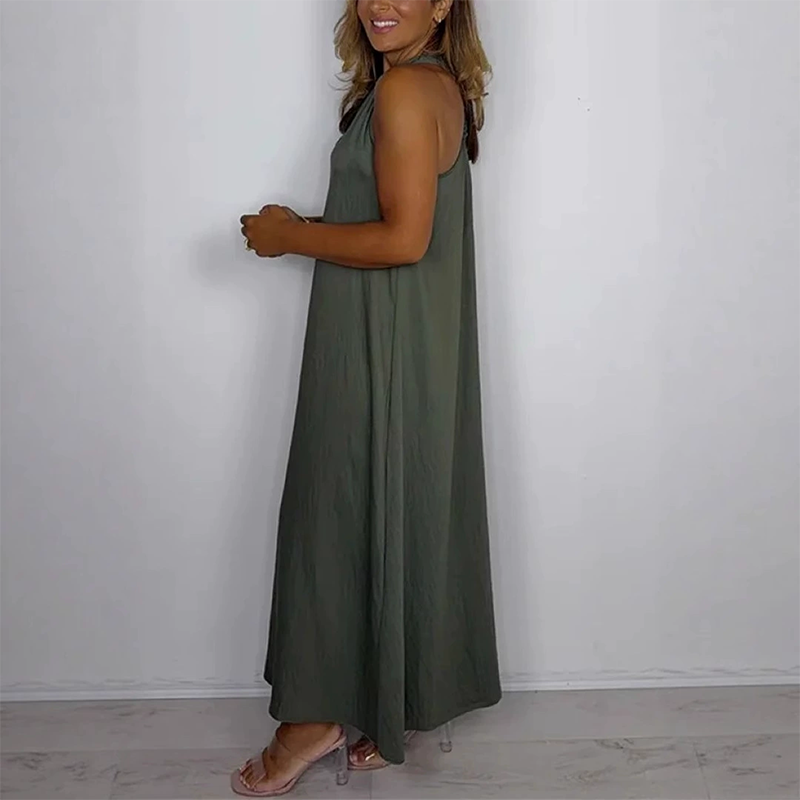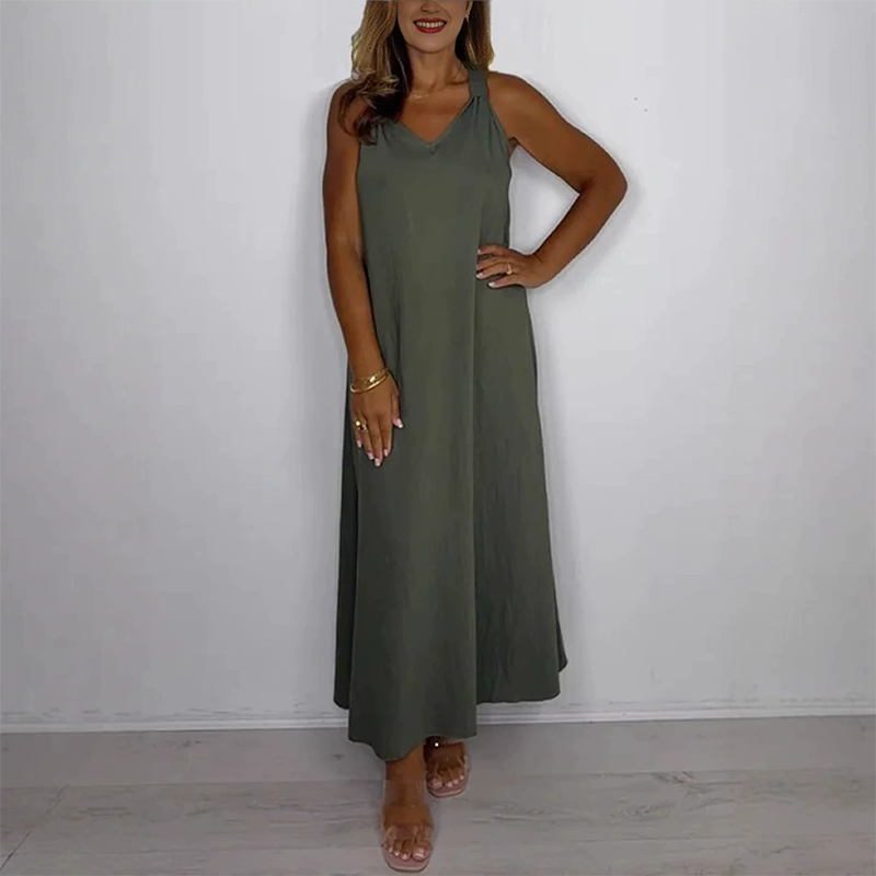 ΣΧΕΔΙΟ ΜΕ V-NECK ΚΑΙ ΧΩΡΙΣ ΜΑΝΙΚΙΑ — Με χαλαρό V-neck και χωρίς μανίκια, αυτό το φόρεμα αυξάνει την έκθεση του δέρματος για καλύτερη ροή αέρα και ελευθερία κινήσεων. Το ανοιχτό ντεκολτέ και τα γυμνά χέρια δημιουργούν μια ελαφριά, αναπνεύσιμη αίσθηση που συμπληρώνει τέλεια την casual, χαλαρή του ατμόσφαιρα, καθιστώντας το ιδανικό για τις ζεστές μέρες χωρίς να δημιουργεί αίσθηση περιορισμού.