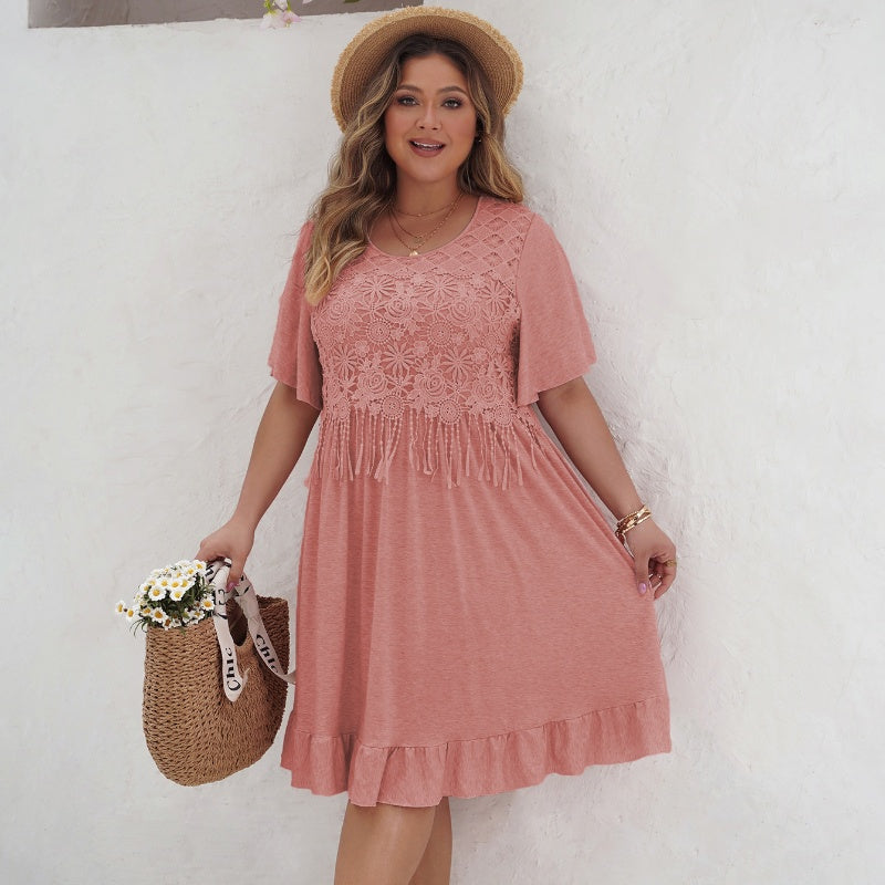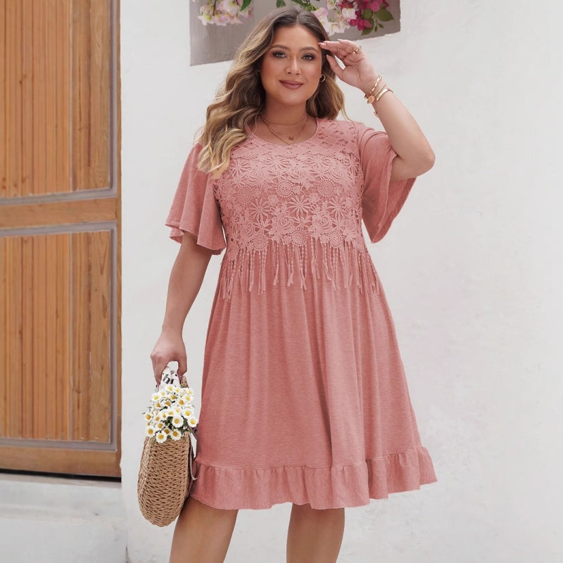 Το πακέτο περιλαμβάνει: 1×Φόρεμα με δαντέλα και φούντες με βολάν στο τελείωμα