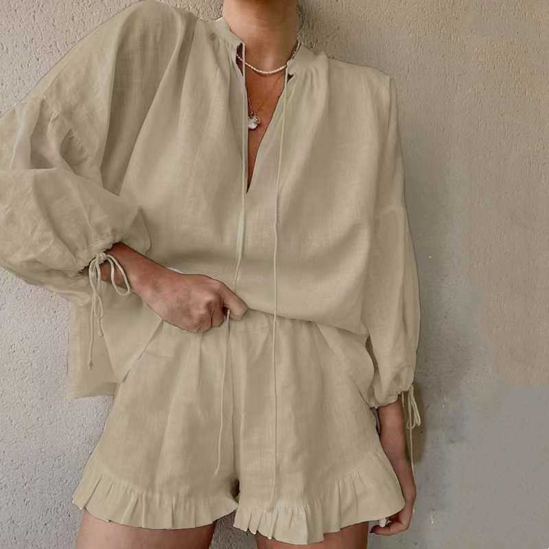 ΚΟΜΨΗ ΓΥΝΑΙΚΕΙΑ ΣΙΛΟΥΕΤΑ – Διαθέτει βαθύ V-neck με κολάρο που δένει και φουσκωτά μανίκια που δημιουργούν ένα κομψό, ρομαντικό look. Το σορτς με βολάν στο τελείωμα και ελαστική μέση προσδίδει μια παιχνιδιάρικη αλλά και εκλεπτυσμένη πινελιά που κολακεύει όλους τους σωματότυπους.