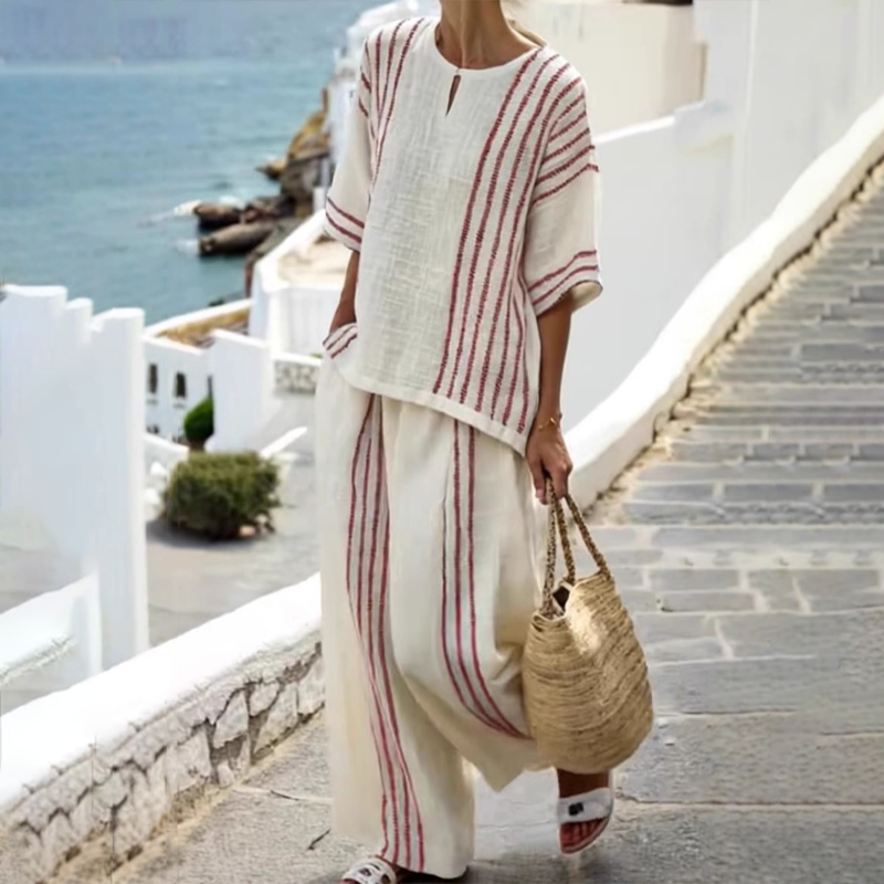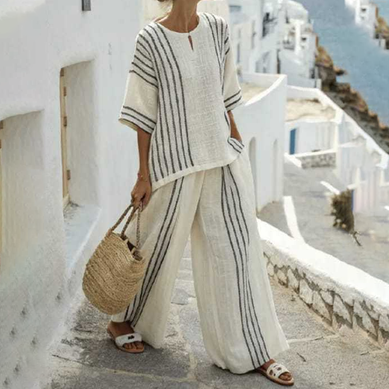 ΣΥΝΤΟΝΙΣΜΕΝΟ ΣΧΕΔΙΑΣΜΟΣ ΡΙΖΙΩΝ: Τόσο το τοπ όσο και το παντελόνι διαθέτουν ένα κομψό ριγέ μοτίβο, δημιουργώντας μια συνεκτική και εντυπωσιακή εμφάνιση κατάλληλη για casual εξόδους ή χαλαρές συγκεντρώσεις.
