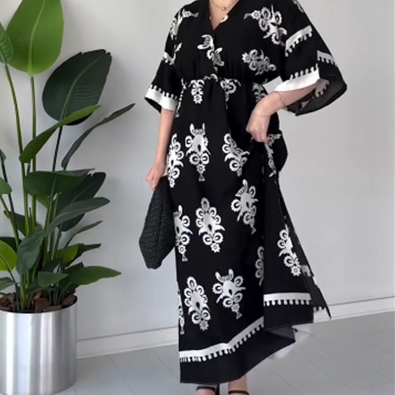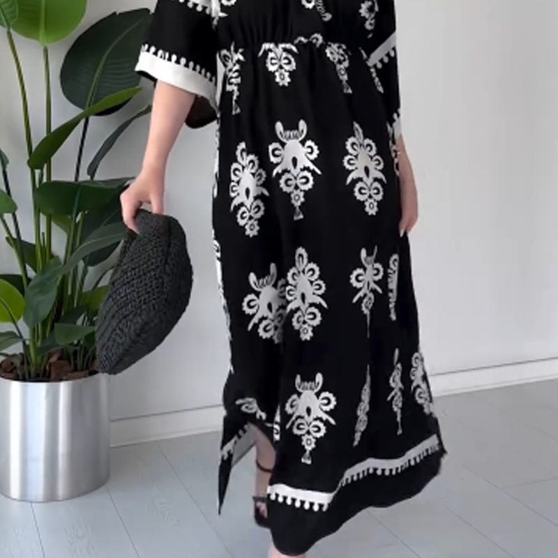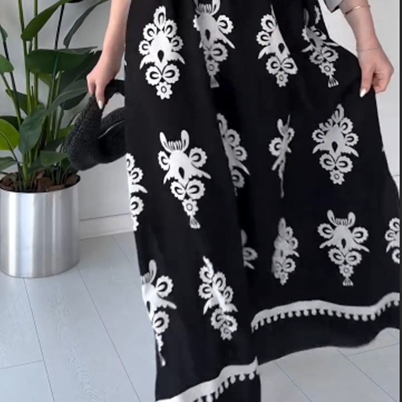 Άνετο και αναπνεύσιμο ύφασμα: Κατασκευασμένο από ένα ελαφρύ, υψηλής ποιότητας ύφασμα που εξασφαλίζει εξαιρετική άνεση και αναπνοή, αυτό το φόρεμα σας επιτρέπει να δροσίζεστε με ευκολία, ενώ παράλληλα αποπνέει αβίαστη κομψότητα.