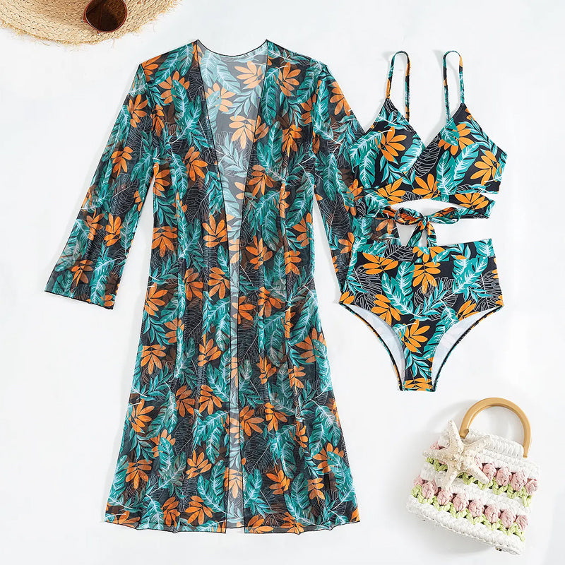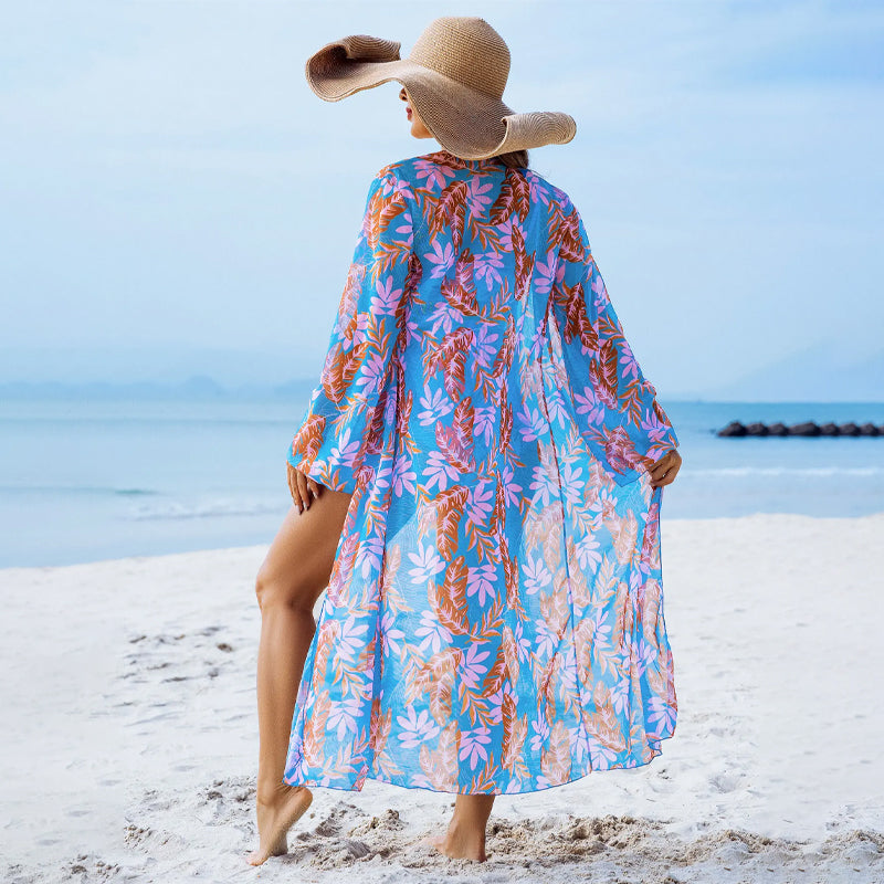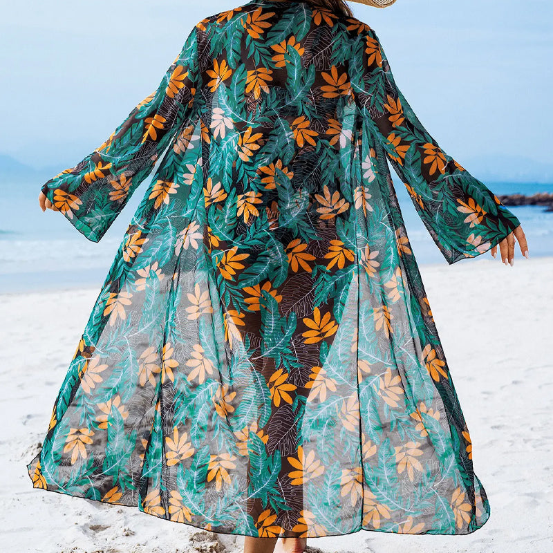 ΜΟΝΤΙΖΟΝΤΑΣ ΦΛΩΡΙΝΗ ΕΙΚΟΝΑ: Το ζωηρό φλοράλ σχέδιο και το κιμονό κάλυψης δημιουργούν έναν κομψό, κομψό και σέξι συνδυασμό ρούχων παραλίας.